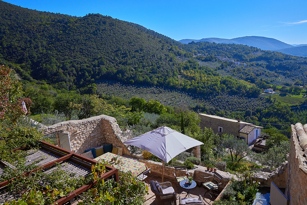 Elevated high above the valley in Campello sul Clitunno, the property enjoys sweeping, protected views across the heart of Umbria, reaching as far as the castle in Spoleto. Often described by guests as “a little piece of heaven.”